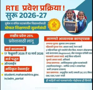 धाराशिव (जिमाका) – बालकांच्या मोफत व सक्तीच्या शिक्षण हक्क कायद्यानुसार (RTE) शैक्षणिक वर्ष २०२६-२७ साठी स्वयंअर्थसहाय्यित व विना अनुदानित शाळांमध्ये...