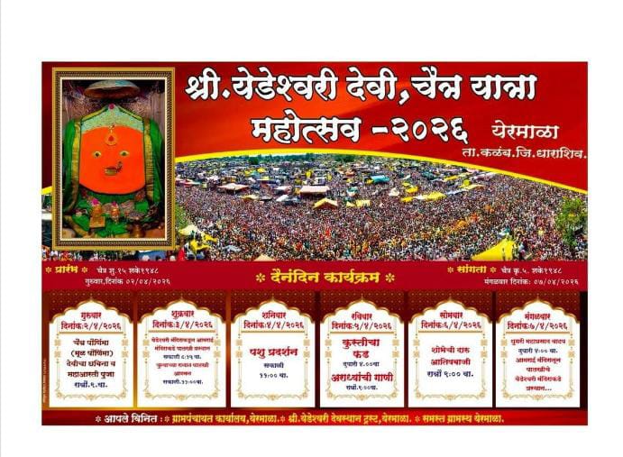 येरमाळा (साक्षी पावनज्योत वृत्तसेवा) – येरमाळा येथील श्री येडेश्वरी देवीची चैत्र पौर्णिमा यात्रा २ एप्रिल २०२६ पासून सुरू होत असून...