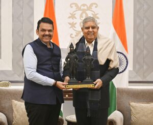 नवी दिल्ली – महाराष्ट्राचे मुख्यमंत्री देवेंद्र फडणवीस यांनी दि.११ डिसेंबर नवी दिल्ली येथे राष्ट्रपती श्रीमती द्रौपदी मुर्मू आणि उपराष्ट्रपती जगदीप धनखड यांची सदिच्छा भेट घेतली. महाराष्ट्राच्या मुख्यमंत्रीपदाची सूत्रे स्वीकारल्यानंतर देवेंद्र फडणवीस यांचा हा पहिलाच दिल्ली दौरा आहे. दिल्लीत आगमन झाल्यावर मुख्यमंत्री देवेंद्र फडणवीस यांनी राष्ट्रपती भवनात जाऊन राष्ट्रपती श्रीमती द्रौपदी मुर्मू यांची भेट घेतली. महाराष्ट्राचे दैवत असलेल्या विठ्ठल-रुख्मिणीची मूर्ती देऊन त्यांचा आदर-सत्कार केला आणि त्यांचे आशिर्वाद घेतले. त्यानंतर मुख्यमंत्री देवेंद्र फडणवीस हे थेट उपराष्ट्रपती जगदीप धनखड यांच्या निवासस्थानी गेले.तेथे त्यांना विठ्ठल-रुख्मिणीची मूर्ती देऊन उपराष्ट्रपती महोदयांचा सत्कार केला आणि त्यांचे आशिर्वाद घेतले.