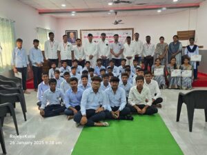 भारतीय प्रजासत्ताक दिनाच्या निमित्ताने धनेश्वरी शिक्षण समूहाचे अध्यक्ष डॉ.प्रतापसिंह पाटील यांच्या प्रेरणेने भैरवनाथ अध्यापक विद्यालयाचे प्राचार्य सतिश मातने यांच्या मार्गदर्शनाखाली वेद शैक्षणिक संकुल अंतर्गत भैरवनाथ अध्यापक विद्यालय व भैरवनाथ औद्योगिक प्रशिक्षण संस्थेत दि.२६ जानेवारी २०२५ रोजी क्रीडा स्पर्धेतील गुणवंत विद्यार्थ्यांचा गौरव करण्यात आला. कार्यक्रमाच्या सुरुवातीला विश्वरत्न डॉ.बाबासाहेब आंबेडकर भारतीय संविधान सुपूर्द करत असलेल्या प्रतिमेचे भैरवनाथ औद्योगिक प्रशिक्षण संस्थेचे प्राचार्य सूरज भांडे यांच्या हस्ते पूजन करून भारतीय तिरंगा ध्वजाचे ध्वजारोहण प्राचार्य सतिश मातने यांच्या हस्ते करण्यात आले.