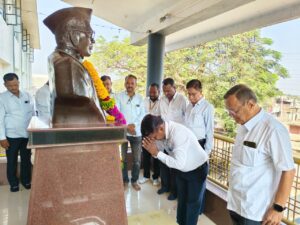 शिक्षण महर्षी ज्ञानदेव मोहेकर महाविद्यालय,कळंब येथे प्रा.नितीन अंकुशराव यांच्या हस्ते गुरुजींच्या पुतळ्यास पुष्पहार अर्पण करण्यात आले. याप्रसंगी ज्ञान प्रसारक मंडळाचे कर्तव्यदक्ष सचिव डॉ.अशोकराव मोहेकर,प्राचार्य डॉ.सुनिल पवार,सा.साक्षी पावनज्योत उपसंपादक तथा उपप्राचार्य डॉ.कमलाकर जाधव,उपप्राचार्य अप्पाराव मिटकरी,ग्रंथपाल अनिल फाटक,उपसंपादक तथा सहा.ग्रंथपाल अरविंद शिंदे आदींची उपस्थिती होती.