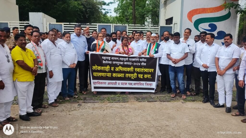 • धाराशिव – महाराष्ट्र जनसुरक्षा विधेयक २०२४ तात्काळ रद्द करण्यात यावे,या मागणीसाठी महाविकास आघाडीच्यावतीने जिल्हाधिकारी कार्यालयासमोर तीव्र आंदोलन करीत केंद्र व राज्य सरकारचा निषेध नोंदविला.तसेच मागण्याचे निवेदन जिल्हाधिकारी यांच्यामार्फत राज्यपालांना दि.१० सप्टेंबर २०२५ रोजी देण्यात आले. दरम्यान जब जब मोदी डरता है… पुलिस को आगे करता है ! तानाशाही नही चलेगी…. मत चोरी… खुर्ची चोरी….. जनसुरक्षा कायदा…रद्द झालेच पाहिजे… हुकूमशाही सरकारचे करायचे काय…खाली मुंडके वर पाय… अशा घोषणांनी परिसर दणाणून सोडला.तर जिल्हाधिकाऱ्यांना निवेदन देण्यासाठी जाणाऱ्या कार्यकर्त्यांना देखील प्रवेशद्वारावरच रोखून धरीत पोलिसांनी दडपशाही करीत हुज्जत घातली.