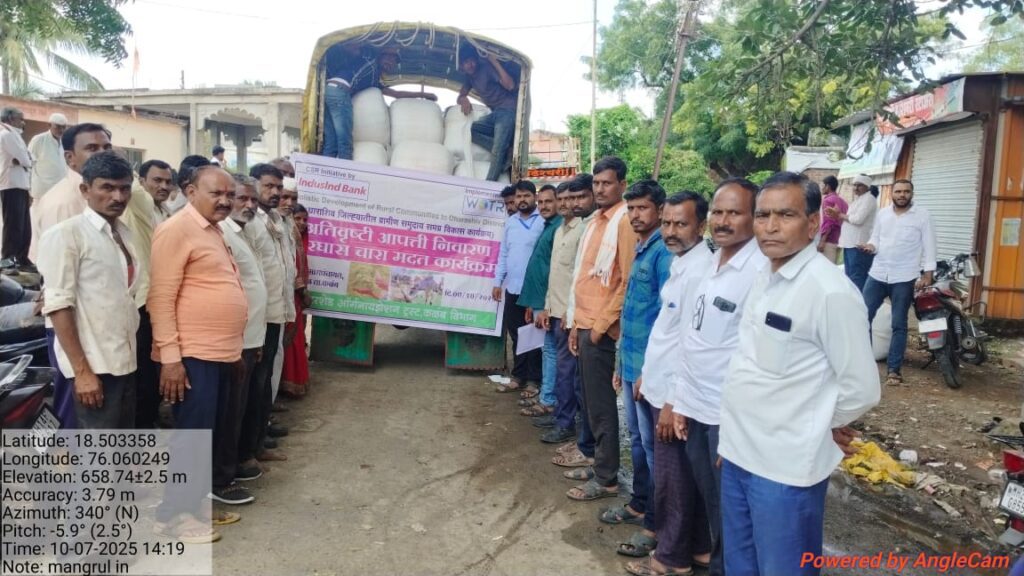 कळंब – धाराशिव जिल्ह्यातील कळंब तालुक्यात अतिवृष्टीमुळे झालेल्या मोठ्या नुकसानीमुळे शेतकरी अडचणीत आले आहेत. पिकांचे मोठे नुकसान झाले असून, अनेक ठिकाणी जनावरे वाहून जाणे, गोठ्यात पाणी शिरल्याने जनावरे दगावणे आणि जनावरांचा चारा वाहून गेल्यामुळे शेतकऱ्यांची चिंता वाढली आहे. शेतकऱ्यांची ही अडचण लक्षात घेऊन वॉटरशेड ऑर्गनायझेशन ट्रस्ट, कळंब यांच्या वतीने आणि इंडसइंड बँक यांच्या अर्थसहायातून अतिवृष्टी आपत्ती निवारण – मुरघास चारा मदत कार्यक्रम घेण्यात आला.इंडसइंड बँकेच्या अर्थसहाय्यातून चालणाऱ्या ‘धाराशिव जिल्ह्यातील ग्रामीण समुदाय समग्र विकास कार्यक्रम’ अंतर्गत कळंब तालुक्यात समुदाय विकास पाणी, माती,शेती,शिक्षण,आरोग्य आणि पोषण या घटकांद्वारे अनेक विकासात्मक कामे झाली आहेत. याच उपक्रमाचा भाग म्हणून आपत्तीकाळात ही मदत करण्यात आली. या मदतीच्या माध्यमातून कळंब तालुक्यातील मंगरूळ,शेलगाव जहागीर आणि सातेफळ या तीन गावांमध्ये एकूण 146 शेतकऱ्यांना त्यांचे जनावरा साठी प्रत्येकी 100 किलो मुरघास चाऱ्याची मदत करण्यात आली. या मदत कार्यक्रमासाठी मंगरूळ येथे डॉ. पूजा राऊत मॅडम -पशुधन विकास अधिकारी,सोनवणे ग्रामसेवक,राहुल निकम तलाठी, केवळबाई शिंदे सरपंच,उपसरपंच समाधान कानडे,ग्राम विकास समिती अध्यक्ष राहुल काळे, भागचंद भागरेचा व शेतकरी ग्रामस्थ उपस्थित होते.तसेच सातेफळ येथे संजीवनी जाधव ग्रामसेवक,महेश मुकदम तलाठी, श्रीकृष्ण नाईकवाडे कृषी सहाय्यक ,वैभव गरड उपसरपंच आणि अनेक ग्रामस्थ उपस्थित होते. वॉटरशेड ऑर्गनायझेशन ट्रस्ट कळंब चे तालुका समन्वयक अनिल वांढेकर,सोसियल ऑफिसर मनेश फंदे,संदीप बारखडे,आशुतोष शिंदे,सागर हाडे,महेश माळी,सुपर व्हायझर अक्रूर जाधव,प्रियांका गायकवाड, उर्मिला तवले उपस्थित होते. अतिवृष्टीमुळे झालेले नुकसान आणि शेतकऱ्यांची बिकट परिस्थिती पाहता, वॉटर संस्थेने केलेल्या या तातडीच्या मदतीबद्दल शेतकरी आणि ग्रामस्थांनी संस्थेचे आणि इंडसइंड बँकेचे मनपूर्वक आभार व्यक्त केले.