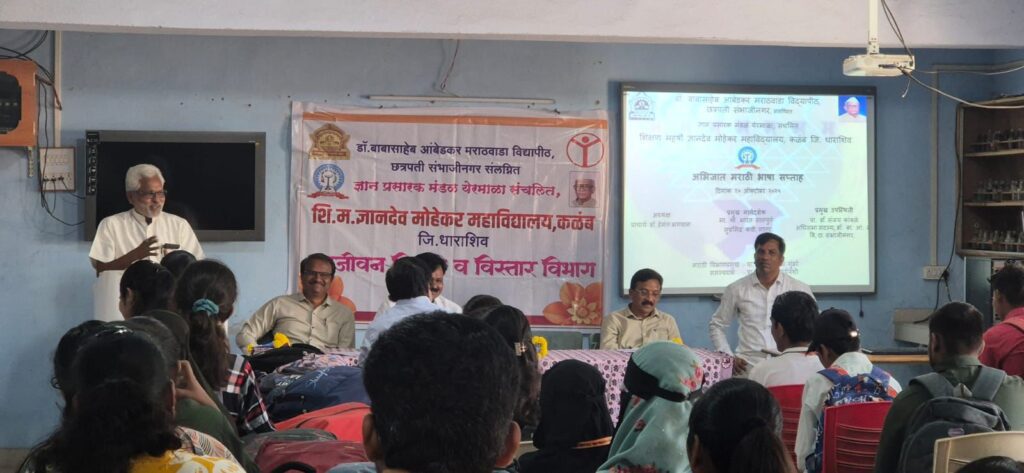 कळंब – ज्ञान प्रसारक मंडळ येरमाळाचे अध्यक्ष अनिल (बापू) मोहेकर व सचिव डॉ.अशोकराव मोहेकर यांच्या प्रेरणेने प्राचार्य डॉ.हेमंत भगवान यांच्या मार्गदर्शनाखाली शिक्षण महर्षी ज्ञानदेव मोहेकर महाविद्यालयातील मराठी विभागाच्यावतीने अभिजात मराठी भाषा सप्ताहानिमित्त कवी भारत सातपुते यांचे मराठी भाषेचे महत्त्व” या विषयावर व्याख्यान आयोजित करण्यात आले होते. त्यावेळी ते म्हणाले, “भाषा एक सामाजिक संस्था असून ती आपल्यावर संस्कार करण्याचे काम करते. मराठी भाषेचा इतिहास आणि साहित्यिक परंपरा समृद्ध आहे. आद्यकवी मुकुंदराज, महात्मा चक्रधर स्वामी,संत ज्ञानेश्वर,तुकाराम यांचे साहित्य आणि त्यांच्या लेखनातून मराठी भाषेचा वारसा दिसून त्यांनी दर्जेदार ग्रंथनिर्मिती केली आहे, म्हणून केंद्र सरकारने मराठीला भाषेला अभिजात दर्जा दिला आहे.आता दैनंदिन व्यवहारात मराठी भाषेचे जास्तीत जास्त मोठ्या प्रमाणावर उपयोजन करणे गरजेचे आहे.त्यामुळे भाषा विकासाला गती मिळणार असून तिचे जतन आणि संवर्धन करण्याची जबाबदारी ही आपल्या सर्वांची आहे. व्यासपीठावर डॉ.संजय कांबळे (अधिसभा सदस्य, डॉ बाबासहेब आंबेडकर मराठवाडा विद्यापीठ, छत्रपती संभाजीनगर),उपप्राचार्य डॉ.कमलाकर जाधव तर कार्यक्रमाच्या अध्यक्षस्थानी प्राचार्य डॉ. हेमंत भगवान होते. भारत सातपुते म्हणाले की, “मराठी भाषा ही केवळ संवादाचे साधन नसून ती समाजाची संस्कृती आणि आत्मा आहे. मराठी भाषेचा समृद्ध इतिहास, वारसा आणि साहित्य आहे. मराठी भाषेचे महत्त्व विशद करताना विविध पैलूंवर प्रकाश टाकला. त्यातून रोजगाराच्या नवनवीन संधी उपलब्ध होत आहेत. फक्त त्यासाठी विद्यार्थ्यांमध्ये प्रयत्न, जिद्द आणि चिकाटी असायला पाहिजे. तसेच यावेळी त्यांनी काही प्रकाशित ग्रंथ महाविद्यालयाच्या ग्रंथालयाला भेट दिले. कार्यक्रमाच्या सुरुवातीला पूज्य ज्ञानदेव मोहेकर गुरुजी यांच्या प्रतिमेचे पूजन करण्यात आले. प्रास्ताविक मराठी विभागप्रमुख डॉ.दादाराव गुंडरे यांनी केले. सप्ताहाच्यानिमित्ताने महाविद्यालयात विविध उपक्रमांचे आयोजन करण्यात आले. या विशेष व्याख्यान कार्यक्रमाचे सूत्रसंचालन समन्वयक प्रा.डॉ.दीपक सूर्यवंशी यांनी केले. तर उपस्थितांचे आभार प्रा.डॉ. ईश्वर राठोड यांनी मानले.यावेळी प्रा.ए.आर.मुखेडकर,प्रा.डॉ.ज्ञानेश चिंते,प्रा.डॉ.श्रीकांत भोसले, प्रा.शाहरुख शेख, प्रा.एच. जे. काझी, प्रा.डॉ. बालाजी वाघमारे, प्रा.डॉ.मीनाक्षी जाधव, प्रा.डॉ.पी. एन वाकडे तसेच अधीक्षक प्रा.हनुमंत जाधव यांनी कार्यक्रमासाठी शिक्षक शिक्षकेत्तर कर्मचारी व विद्यार्थी मोठ्या संख्येने उपस्थित होते.