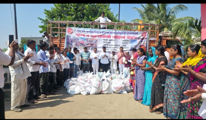 कळंब – तालुक्यात ऑगस्ट महिन्यापासून सुरू असलेल्या अतिवृष्टीमुळे शेतकऱ्यांचे पिके तसेच काही गावांमध्ये घरात पाणी शिरून अन्नधान्यासह संसारोपयोगी वस्तूंचाही मोठा नुकसान झाला.या परिस्थितीवर दखल घेत गेल्या पंधरा दिवसांपूर्वी जाफराबादकरांनी सामाजिक कार्यकर्ते प्रभू गाढे,ग्रामसेवक लोखंडे,प्रा.वायाळ आणि विठ्ठल नाखोड यांच्या सहकार्याने ४५ क्विंटल धान्य व संसारोपयोगी साहित्य पाठवून मदत केली होती. पुढील पावसामुळे पुनःनुकसान झाल्याने विठ्ठल माने व पत्रकार परमेश्वर पालकर यांनी भोकरदन येथील लोकजागर सामाजिक संस्थेचे संस्थापक अध्यक्ष केशव पाटील जंजाळ यांच्याशी संपर्क साधला. त्यानंतर मंगळवारी सकाळी आठशे किट घेऊन कळंब तालुक्यात मदत पोहोचवण्यात आली. या किटमध्ये गहू, तांदूळ, डाळी, तेल,रवा,साखर,ताट,तांब्या, साडी, ब्लँकेट इत्यादी जीवनावश्यक वस्तूंचा समावेश होता. हे किट एकूरगा, जवळा, पिंपळगाव (को), भोगजी, आडसूळवाडी, ईटकूर, गंभीरवाडी, बोरगाव (ध) या गावांमध्ये नुकसानग्रस्तांना वाटप करण्यात आले. वाटप कार्यात लोकजागर संस्थेचे अध्यक्ष केशव पाटील जंजाळ, जाफराबादचे सामाजिक कार्यकर्ते प्रभू गाढे,गजानन फड,सचिन तेलंगरे,आदित्य सोनी,गौरव कुदर, साहेबराव गावंडे,भागवत कानडजे,नारायण जाधव,रामदास गाढे,राजू भवर,फकीरबा उबाळे, अशोक इचचे,दगडूबा सुसर,हसन चाऊस,चाऊस अली,भगवान महाराज इचचे हे शेतकरी बांधव उपस्थित होते. हे किट गरजू पर्यंत पोहचवण्यासाठी राष्ट्रवादी उद्योग आघाडीचे जिल्हाध्यक्ष विठ्ठल माने, अखिल भारतीय मराठी साहित्य परिषदेचे मराठवाडा अध्यक्ष परमेश्वर पालकर, अभयसिंह आडसुळ,शिवाजी पाटील,धनंजय घोगरे,रामेश्वर जाधवर,रोहित आडसुळ यांच्याही सहकार्याने मदत केली गेली. नुकसानग्रस्तांनी भोकरदन आणि जाफराबादकरांचे मनःपूर्वक आभार मानले.