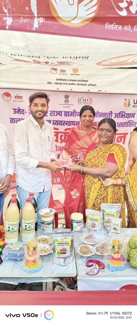 कळंब – उमेद – महाराष्ट्र राज्य ग्रामीण जीवनोन्नती अभियान, तालुका अभियान व्यवस्थापन कक्ष,पंचायत समिती कळंब यांच्या वतीने दीपावली महोत्सव 2025 दिनांक 15 ते 17 ऑक्टोबर 2025 दरम्यान आयोजित करण्यात आला आहे. या महोत्सवात कळंब तालुक्यातील स्वयंसहाय्यता समूहातील महिलांनी उत्पादित केलेल्या अस्सल हस्तकला वस्तू, कलाकुसर उत्पादने आणि सुकामेव्याचे आकर्षक प्रदर्शन व विक्री आज कळंब शहरातील शिवाजी महाराज चौकात पार पडले. महोत्सवाचे उद्घाटन नायब तहसीलदार (महसूल) गोकुळ भराडीया यांच्या हस्ते फीत कापून करण्यात आले.यावेळी त्यांनी मार्गदर्शन करताना सांगितले की, “महिलांनी साकारलेली उत्पादने दर्जेदार व आकर्षक आहेत. तहसील कार्यालयाच्या माध्यमातून स्वयंसहाय्यता गटांना आवश्यक ती मदत दिली जाईल.तसेच महिलांनी विविध शासकीय योजनांसाठी जास्तीत जास्त अर्ज करावेत,”असे आवाहन त्यांनी केले. यावेळी तालुका अभियान व्यवस्थापक अलंकार बनसोडे यांनी शहरातील नागरिक, शासकीय अधिकारी व कर्मचारी यांनी या प्रदर्शनास भेट देऊन स्थानिक उत्पादक महिलांना प्रोत्साहन द्यावे,असे आवाहन केले. कार्यक्रमास तालुका व्यवस्थापक अभिजीत पडवळ,पवन पवार, प्रभाग समन्वयक अमोल सालपे, सूर्यकांत खेडकर,खंडू बर्डे,मकरंद कुलकर्णी,अनिता बेडके,विनोद घोळवे,पांडुरंग भुजबळ,CLF मॅनेजर सपना सुरवसे,तसेच CRP, उपजीविका सखी आणि मोठ्या संख्येने उत्पादक महिला उपस्थित होत्या.