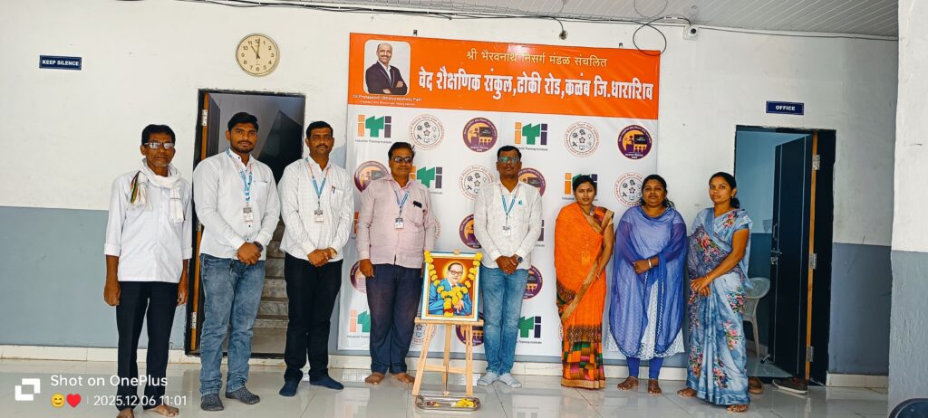 कळंब – धनेश्वरी शिक्षण समूहाचे अध्यक्ष डॉ.प्रतापसिंह पाटील यांच्या प्रेरणेने प्राचार्य सतिश मातने यांच्या मार्गदर्शनाखाली वेद शैक्षणिक संकुल अंतर्गत भैरवनाथ अध्यापक विद्यालय व भैरवनाथ औद्योगिक प्रशिक्षण संस्थेत दि.६ डिसेंबर २०२५ रोजी विश्वरत्न डॉ.बाबासाहेब आंबेडकर यांना ६९ व्या महापरिनिर्वाण दिनानिमित्त अभिवादन करण्यात आले. याप्रसंगी भैरवनाथ अध्यापक विद्यालयाचे प्रा.श्रीकांत पवार, प्रा. सुकेशनी गव्हाणे, प्रा.मोहिनी शिंदे,भैरवनाथ औद्योगिक प्रशिक्षण संस्थेचे निदेशक अविनाश म्हेत्रे,निदेशक राजकुमार शिंदे,आदित्य गायकवाड,दीक्षा गायकवाड, विनोद कसबे,सोनाली ढमाले सर्व छात्राध्यापक व प्रशिक्षणार्थींची उपस्थिती होती.