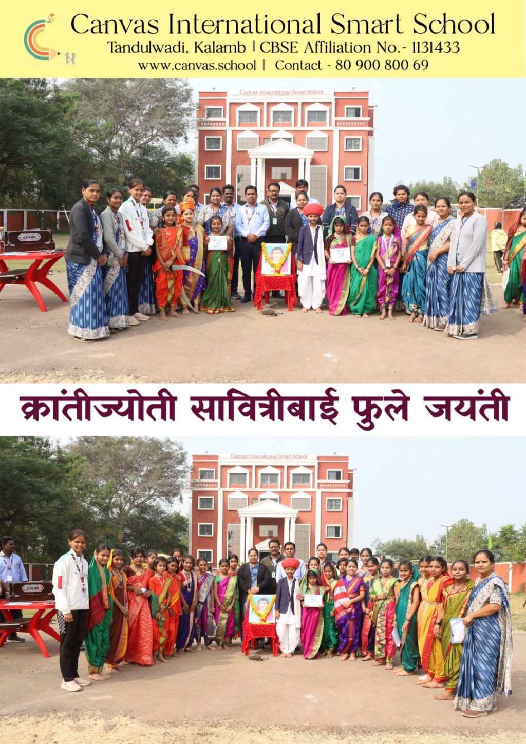 कळंब – कॅनव्हास इंटरनॅशनल स्मार्ट स्कूल येथे क्रांतीज्योती सावित्रीबाई फुले यांची १७५ वी जयंती मोठ्या उत्साहात व भक्तिभावाने साजरी करण्यात आली. या प्रसंगी अध्यक्ष रवी नरहिरे, उपाध्यक्षा सौ.आशा नरहिरे व सचिव प्रणव नरहिरे यांनी उपस्थितांना जयंतीच्या शुभेच्छा दिल्या. कार्यक्रमाच्या प्रारंभी शाळेचे मुख्याध्यापक पवनकुमार कुलकर्णी यांनी दीपप्रज्वलन व प्रतिमापूजन करून अभिवादन केले.धावारे बंधूंनी सावित्रीबाईंच्या कार्याचा प्रभावी आढावा घेत नमनगीत सादर करून वातावरण प्रेरणामय केले. इयत्ता ४ ते ६ वीतील विद्यार्थिनींनी सावित्रीबाईंच्या पारंपरिक वेशभूषेत मनोगत व्यक्त केले. तसेच ओव्या व प्रश्नमंजुषा या उपक्रमातून विद्यार्थ्यांनी आपले विचार मांडले. मुख्याध्यापकांनी मार्गदर्शन करताना स्त्री शिक्षणासाठी सावित्रीबाईंनी केलेला संघर्ष हे सतत प्रेरणादायी आदर्श असल्याचे सांगितले. कार्यक्रमाचे सूत्रसंचालन इयत्ता पाचवीतील चिमुकल्या विद्यार्थिनी राजनंदिनी शितोळे व सृष्टी गुरव यांनी केले तर आभार प्रदर्शन सौ. पूजा भोसले यांनी केले. सांस्कृतिक विभाग प्रमुख प्रशांत भोले,सौ.अर्चना बावीकर,प्रीतम वेदपाठक,हरिदास रोकडे,प्रशांत व विशाल धावरे तसेच सर्व शिक्षक व कर्मचारी मोठ्या संख्येने उपस्थित होते.