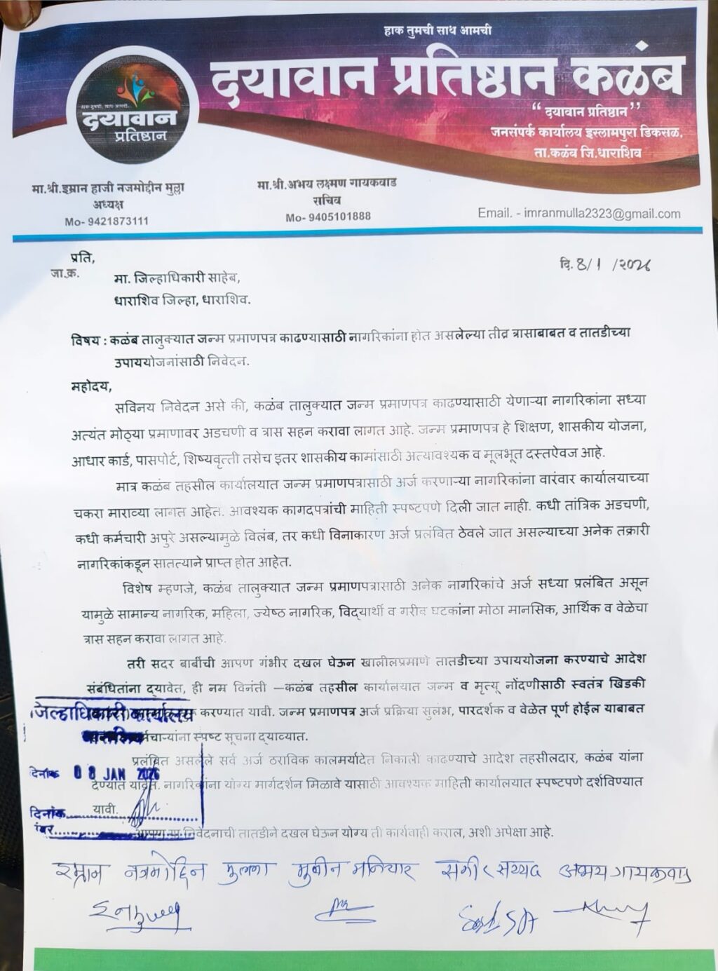 कळंब – कळंब तालुक्यात जन्म प्रमाणपत्र काढताना नागरिकांना येणाऱ्या विविध अडचणी, अनावश्यक विलंब व गैरसोयींबाबत दयावान प्रतिष्ठान, कळंब यांच्या वतीने धाराशिव जिल्ह्याचे जिल्हाधिकारी कीर्तीकिरण पुजार यांना सविस्तर निवेदन सादर करण्यात आले. निवेदनात जन्म प्रमाणपत्रासाठी अर्ज केल्यानंतर प्रकरणे दीर्घकाळ प्रलंबित राहणे,स्पष्ट व एकसंध मार्गदर्शनाचा अभाव,वारंवार तहसील कार्यालयात फेऱ्या माराव्या लागणे यामुळे नागरिकांना मानसिक व आर्थिक त्रास सहन करावा लागत असल्याचे नमूद करण्यात आले आहे. जन्म प्रमाणपत्र हे शिक्षण, विविध शासकीय योजना,आधार कार्ड, पासपोर्ट आदींसाठी अत्यावश्यक दस्तऐवज असल्याने त्याची प्रक्रिया अधिक सुलभ, पारदर्शक व वेळेत पूर्ण होणे गरजेचे असल्याचेही निवेदनात स्पष्ट करण्यात आले. तसेच कळंब तहसील कार्यालयात जन्म–मृत्यू नोंदणीसाठी स्वतंत्र काउंटर सुरू करणे, आवश्यक कागदपत्रांची माहिती ठळकपणे दर्शविणे, अर्जांच्या स्थितीची माहिती नागरिकांना सहज उपलब्ध होईल अशी यंत्रणा उभारणे तसेच प्रलंबित अर्ज तातडीने निकाली काढण्याचे निर्देश देण्याची मागणी करण्यात आली आहे. या उपाययोजनांमुळे सामान्य नागरिकांचा वेळ व खर्च वाचून मोठा दिलासा मिळेल, असा विश्वास व्यक्त करण्यात आला. या निवेदनाच्या माध्यमातून कळंब तालुक्यातील नागरिकांच्या जिव्हाळ्याच्या प्रश्नांवर जिल्हा प्रशासनाकडून लवकरात लवकर सकारात्मक व ठोस निर्णय घेतला जाईल, अशी अपेक्षा दयावान प्रतिष्ठान, कळंब यांच्या वतीने व्यक्त करण्यात आली आहे. या निवेदनावर दयावान प्रतिष्ठानचे संस्थापक अध्यक्ष इम्रान भाई मुल्ला,ग्रामपंचायत सदस्य मुबीन मणियार,युवा उद्योजक समीर सय्यद,प्रतिष्ठानचे सचिव अभय गायकवाड यांच्यासह प्रतिष्ठानच्या पदाधिकाऱ्यांच्या स्वाक्षऱ्या आहेत.