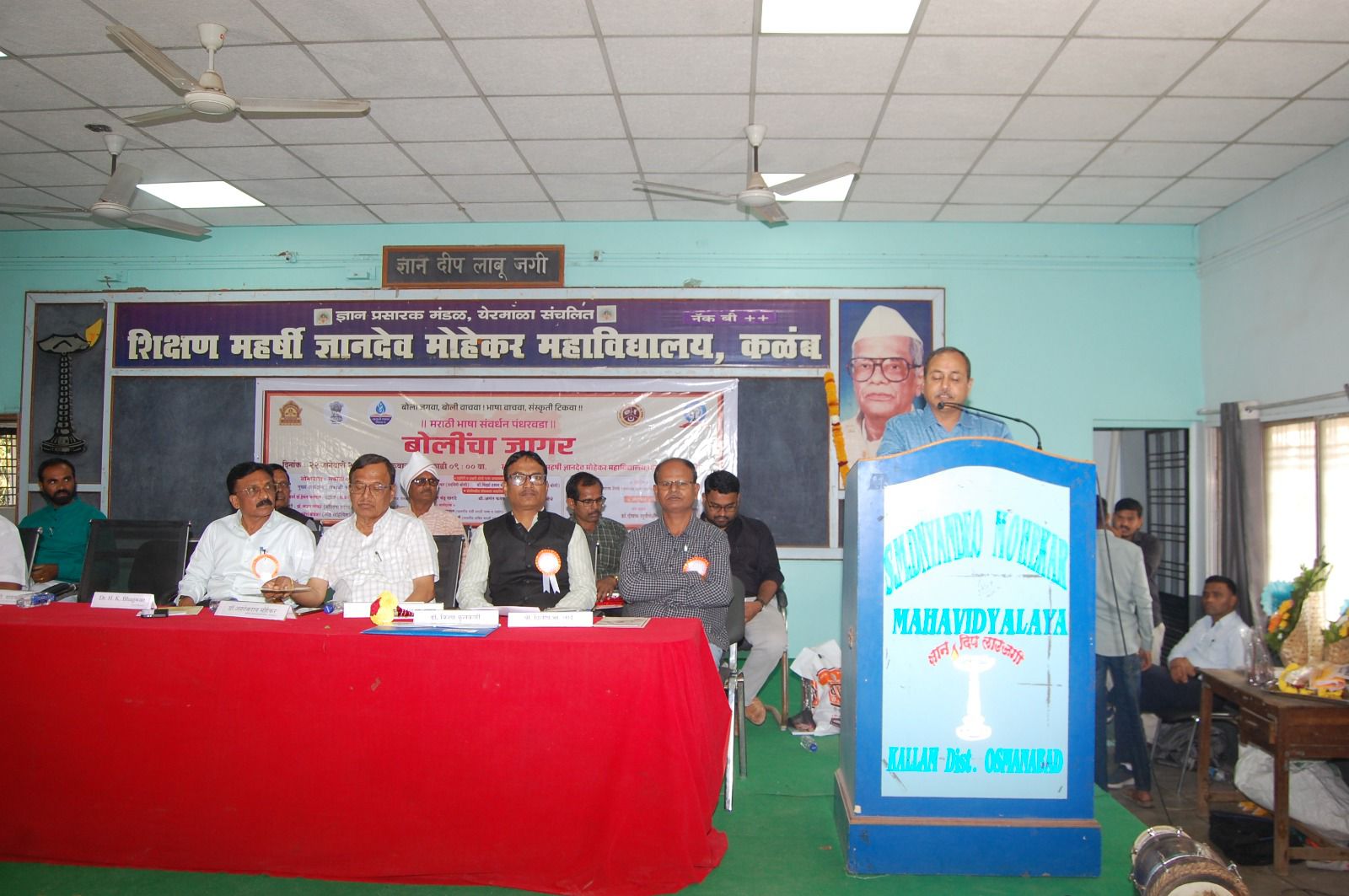 कळंब – भाषा संचालनालय महाराष्ट्र राज्य यांच्या सहकार्याने डॉ.बाबासाहेब आंबेडकर मराठवाडा विद्यापीठ छत्रपती संभाजीनगर संलग्नित ज्ञान प्रसारक मंडळ येरमाळाचे कर्तव्यदक्ष सचिव डॉ.अशोकराव मोहेकर यांच्या मार्गदर्शनाखाली शिक्षण महर्षी ज्ञानदेव मोहेकर महाविद्यालयात बोलींचा जागर कार्यक्रम आयोजित करण्यात आला. या विशेष कार्यक्रमाला मार्गदर्शन करताना शरद यादव (सहायक संचालक,भाषा संचालनालय, मंत्रालय,मुंबई)) म्हणाले,मराठी भाषा प्राचीन असून तिच्या इतिहासासोबत भौगोलिक क्षेत्र सामाजिक व सांस्कृतिक परंपरा यांचाही विकास होतो.भाषा संस्कृती रुजविण्याचे काम करते, पुढील पिढीस हा वारसा जतन करण्याचे सामाजिक भान आणून देण्यासाठी हा कार्यक्रम महत्त्वाचा ठरतो. शासकीय आणि विद्यापीठ संलग्न महाविद्यालयामध्ये हा कार्यक्रम घेण्यात आला.त्यामधून मराठी भाषा प्रगल्भ असून तिचे संवर्धन करणे काळाची गरज आहे मराठी भाषा संवर्धन पंधरवडानिमित्त महाराष्ट्र शासनाने ३६ जिल्ह्यात बोलींच्या जागर आयोजित करण्यात आला आहे, याचाच एक भाग म्हणून मोहेकर महाविद्यालयात जिल्हास्तरीय बोलीचा जागर हा कार्यक्रम राबविण्यात आला. प्रारंभी भव्य ग्रंथदिंडी व शोभायात्रेच्या या माध्यमातून महाविद्यालयाच्या परिसरात बोली जगवा,बोली वाचवा,भाषा वाचवा, संस्कृती टिकवा,मी मराठी माझी मराठी या जयघोषात काढण्यात आली.यामध्ये शिवप्रसाद शर्मा व राज सरवदे यांनी महाराष्ट्रीयन लोककला लावणी,वाघ्या मुरळी, वेशभूषा व शाहीर बंडू खराटे यांनी बोलीभाषेवर पोवाडा सादर केला. कार्यक्रमाचे सुरुवात महाराष्ट्र गीताने पूज्य ज्ञानदेव मोहेकर गुरुजींच्या प्रतिमापूजन व दीपप्रज्वलनाने करण्यात आली. उद्घाटन ज्ञान प्रसार मंडळ संस्थेचे सचिव डॉ.अशोकराव मोहेकर यांच्या हस्ते करण्यात आले. यावेळी उदगीरी बोली अभ्यासक प्रसाद कुमठेकर दखनी बोली मिर्झा बेग,डी.के.शेख तसेच बोली कलावंत अनंत कदम,हनुमंत म्हेत्रे यांनी उदगिरी बोलीचे महत्व आपल्या मार्गदर्शनातून पटवून दिले. याप्रसंगी शासनाच्या वतीने डॉ.आनंद गांगण (अनुवादक, मंत्रालय) यांनी मराठवाडा,विदर्भ, खानदेश व पश्चिम महाराष्ट्र म्हणजेच चांदा ते बांद्यापर्यंत भाषा संवर्धनाची ही जबाबदारी आपल्या सर्वांची आहे.त्यासाठी निश्चितच शासनाची सहकार्याची भूमिका असल्याचे विशद केले. व्यासपीठावर महेश लगड (अनुवादक,मंत्रालय), दिलीप लादे, (वरीष्ठ लिपिक, मंत्रालय) संचालक डॉ.डी.एस.जाधव, ज्येष्ठ कवी रमेश बोर्डेकर, डॉ.संजय कांबळे (अधिसभा सदस्य डॉ.बाबासाहेब आंबेडकर मराठवाडा विद्यापीठ), अध्यक्षस्थानी प्राचार्य डॉ. हेमंत भगवान उपस्थित होते. यावेळी सर्व मान्यवरांना बोलीभाषा विषयक,आदर्श मराठी व्याकर