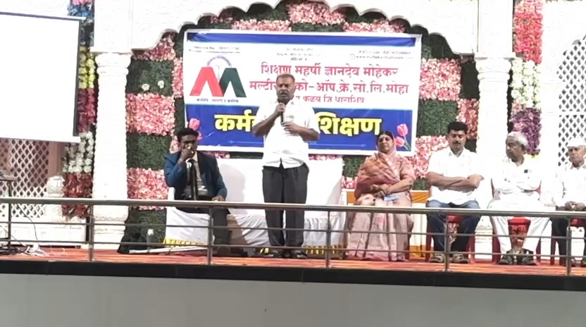 कळंब (अविनाश घोडके )–शिक्षण महर्षी ज्ञानदेव मोहेकर मल्टीस्टेट को–ऑप. क्रेडिट सोसायटी लि.,मोहा येथील सर्व कर्मचाऱ्यांसाठी एक दिवसीय प्रेरणादायी प्रशिक्षण शिबिर शनिवार,दि.७ मार्च २०२६ रोजी कळंब येथील साई मंगलम मंगल कार्यालयात उत्साहात संपन्न झाले. संस्थेचे संस्थापक चेअरमन तथा शि.म.ज्ञानदेव मोहेकर उद्योग समूहाचे अध्यक्ष हनुमंत (तात्या) मडके यांच्या अध्यक्षतेखाली आयोजित या प्रशिक्षण शिबिरात प्रसिद्ध मोटिव्हेशनल स्पीकर भूषण खैरनार यांनी कर्मचाऱ्यांना मार्गदर्शन केले.