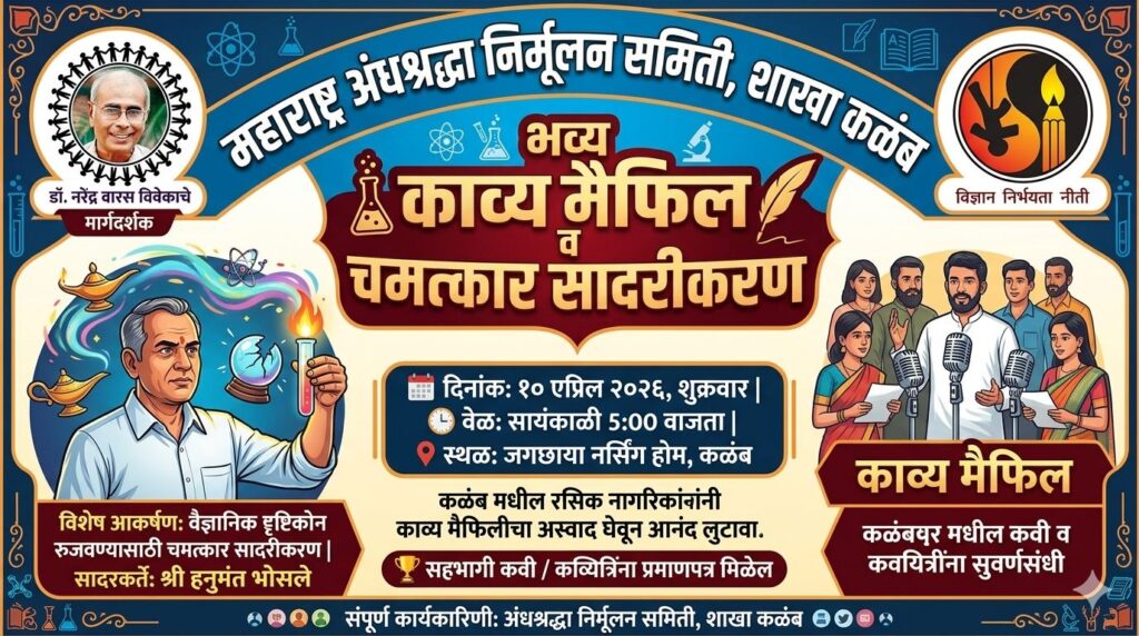 • कळंब – महाराष्ट्र अंधश्रद्धा निर्मूलन समिती,शाखा कळंब यांच्या वतीने १० एप्रिल २०२६ रोजी सायंकाळी ५ वाजता जगछाया नर्सिंग होम येथे “काव्य मैफिल व चमत्कार सादरीकरण” या विशेष कार्यक्रमाचे आयोजन करण्यात आले आहे.समाजात वैज्ञानिक दृष्टिकोन रुजवणे आणि अंधश्रद्धेविरुद्ध जनजागृती करणे हा या उपक्रमाचा मुख्य उद्देश आहे.