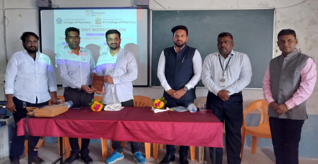धाराशिव – डॉ.वेदप्रकाश पाटील शैक्षणिक संकुल, धाराशिव येथे धनेश्वरी शिक्षण समूहाचे अध्यक्ष डॉ.प्रतापसिंह पाटील यांच्या मार्गदर्शनाखाली एस.बी.एन.एम. कॉलेज ऑफ फार्मसी व आर. पी. कॉलेज ऑफ फार्मसी यांच्या संयुक्त विद्यमाने डी. फार्मसी अभ्यासक्रमाच्या विद्यार्थ्यांकरिता “औषधनिर्माणशास्त्र क्षेत्रातील करियर व व्यवसाय संधी” याबाबत एकदिवसीय कार्यशाळेचे आयोजन करण्यात आले होते. या कार्यशाळेकरिता प्रमुख मार्गदर्शक म्हणून ग्लोबल फार्मा अकॅडेमी चे संस्थापक अमित माने व अम्पिम-एक्स इंडिया प्रायवेट लिमिटेड कंपनीचे संचालक अँड. अमोल पाटील, एस.बी.एन.एम. कॉलेज ऑफ फार्मसीचे प्राचार्य डॉ.सूरज ननवरे, आर. पी. कॉलेज ऑफ फार्मसीचे प्राचार्य डॉ.गाझी शेख व डी.फार्मसीचे विभाग प्रमुख प्रा. सुबोध कांबळे उपस्थित होते.