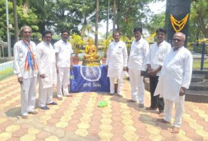 कळंब – विश्वाला शांततेचा संदेश देणारे महाकारूणिक भगवान तथागत गौतम बुद्ध यांच्या २५६८ व्या जयंतीनिमित्त दि.२३ मे २०२४ रोजी कळंब शहरातील विश्वरत्न डॉ.बाबासाहेब आंबेडकर पुतळा परिसर येथे स्मारक समितीच्या वतीने तथागत गौतम बुद्ध मूर्ती व विश्वरत्न डॉ.बाबासाहेब आंबेडकर यांच्या पुतळ्यास पुष्पहार अर्पण करून अभिवादन करण्यात आले. पंचशील ध्वजाचे ध्वजारोहण प्रबुद्ध रंगभूमी बहुउद्देशीय संस्थेचे अध्यक्ष सुभाष घोडके यांच्या हस्ते करून सामुदायिकरित्या त्रिशरण पंचशील घेण्यात आले. यावेळी भारतीय बौद्ध महासभेचे सी.आर.घाडगे,राजाराम वाघमारे,मारुती गायकवाड,भास्कर सोनवणे,निवृत्ती हौसलमल,उत्तम कांबळे,स्मारक समितीचे विश्वस्त माजी नगरसेवक डॉ.सुनील गायकवाड,शिवाजी सिरसट,राजाभाऊ गायकवाड,प्रमोद ताटे,शंकर वाघमारे,रमेश बोर्डेकर,रसूल खान,भाऊसाहेब कुचेकर,किशोर वाघमारे,उत्तम सावंत,माणिक गायकवाड,सचिन तिरकर,महावीर गायकवाड,मधुकर शिलवंत,शहाजी सिरसट,सुनिल तवले,प्रा.अविनाश घोडके,प्रशांत धावारे,भैय्या जानराव आदींची उपस्थिती होती.