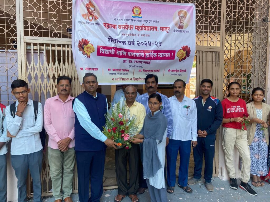 लातूर – महात्मा बसवेश्वर कनिष्ठ महाविद्यालय, लातूर येथे बारावी कला, वाणिज्य आणि विज्ञान शाखेतील विद्यार्थ्यांच्या आज दि. १८ जून २०२४ पासून नियमित वर्गांना सुरुवात झाली. महात्मा बसवेश्वर कनिष्ठ महाविद्यालयातील बारावी कला, वाणिज्य आणि विज्ञान शाखेतील विद्यार्थ्यांचे आणि त्यांच्या पालकांचा महात्मा बसवेश्वर महाविद्यालयाचे प्रभारी प्राचार्य डॉ. संजय गवई यांच्या हस्ते पुष्पहार तर विद्यार्थ्यांचा पुष्पगुच्छ आणि पेढे देऊन सत्कार करण्यात आला. यावेळी उपप्राचार्य प्रा. संजय पवार, पर्यवेक्षक प्रा. शिवशरण हावळे, बोर्ड समन्वयक डॉ. गुणवंत बिरादार, कार्यालय प्रमुख नामदेव बेंदरगे, शिक्षक व शिक्षकेतर कर्मचारी यांची उपस्थिती होती. आज महाविद्यालयातील बारावी कला, वाणिज्य आणि विज्ञान शाखेतील विद्यार्थ्यांचा पहिला दिवस असल्याने स्वागत समारंभाचे आयोजन करण्यात आले होते. यावेळी विद्यार्थ्यांना शुभेच्छा देताना प्रभारी प्राचार्य डॉ. संजय गवई म्हणाले की, महात्मा बसवेश्वर महाविद्यालय हे महाराष्ट्रातील ०५ शाखांमधून शिक्षण देणारे एकमेव महाविद्यालय आहे. या महाविद्यालयाला नॅकने अ दर्जा बहाल केला आहे. महाविद्यालयात येणारा विद्यार्थी ग्रामीण व शहरी भागातील असून गरीब आणि गरजू विद्यार्थी येथे शिक्षण घेतात. आज पालक आणि विद्यार्थ्यांचा स्वागत समारंभ बघून मनस्वी आनंद झाला. यावेळी उपप्राचार्य प्रा. संजय पवार म्हणाले की, लातूरच्या शैक्षणिक प्रगतीमध्ये नियमित वर्गात उपस्थित राहून नियमित अभ्यास केल्यास विद्यार्थ्यांच्या गुणवत्तेमध्ये वाढ होते. हा लातूर पॅटर्नचा यशस्वी होण्याचा सर्वोत्तम मार्ग आहे. याशिवाय विद्यार्थ्यांच्या इतर कलागुणांचा व विविध सांस्कृतिक कार्यक्रमामुळे वाढ होते असे सांगून त्यांनी विद्यार्थ्यांना शैक्षणिक वर्ष २०२४-२५ साठी हार्दिक शुभेच्छा दिल्या. या कार्यक्रमाचे आभार पर्यवेक्षक प्रा. शिवशरण हावळे यांनी मानले. यावेळी कार्यालय प्रमुख नामदेव बेंदरगे यांनीही विद्यार्थी आणि पालकांना शुभेच्छा दिल्या. या कार्यक्रमाच्या यशस्वीतेसाठी राजाभाऊ बोडके, शुभम बिरादार आणि जगन्नाथ येचेवाड यांनी परिश्रम घेतले.