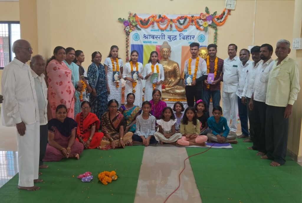 लातुर – शहरातील श्रावस्तीनगर (विक्रमनगर) येथे प्रा.शिवशरण हावळे यांच्या अध्यक्षतेखाली आणि कुसुम बानाटे,अध्यक्षा,श्रावस्ती महिला मंडळ यांच्या प्रमुख ऊपस्थितीत १० वी,१२ वी मधील गुणवंतांचा गौरव सोहळा संपन्न झाला. कार्यक्रमाच्या सुरुवातीला तथागत गौतम बुद्ध,विश्वरत्न डॉ. बाबासाहेब आंबेडकर प्रतिमेचे धुप,दिपं,पुष्पाने वंदन केले.ज्योती घारगावकरांच्या नेतृत्वाखाली बुद्ध वंदना घेतली.मग गुणवंत विद्यार्थी कु.संकेत शिवराज कांबळे,कु.प्रणाली सुनिल कांबळे,कु.सन्मेष महेंद्र जोगदंड,कु.अक्षता रवि माकेगावकर आणि कु.प्रज्ञा सुनिल कांबळे यांचा पालकासह फुलहार आणि धम्मग्रंथ भेट देवुन गौरव केला.यावेळी कु.रिया गोरे या छोटीने खुपच छान भाषण केले.तर प्रा.शिवशरण हावळे यांनी गुणवंतांना खुपच प्रेरक आणि याही पेक्षा जिवनात मोठे यश संपादन करण्यासाठी पंचसुत्री तत्वाचा अंगीकार करण्याचा सल्ला देत खुप खुप शुभेच्छा दिल्या.या कार्यक्रमाचे संचलन व प्रास्ताविक करुन आभार मानताना विहाराचे सचीव प्रा.विलास घारगावकरांनी सर्वांनीच जिवनातील विकाराचे हरण करून कुशल कर्माचा संचय करत यशवंत,किर्तीवंत नि समृद्ध विचाराचा आदर्श नागरीक होण्याचे आवाहन केले.यावेळी मंगल धायगुडे,करुणा कांबळे,अल्का कांबळे,संजीवनी गुंजुरगे,अनुसया कांबळे,सुरेखा सवाई,विष्णुपंत सवाई,प्रभाकर करवंजे,सुर्यवंशी बाबा,गायकवाड सर,प्रा.प्रकाश आडसुळ,समाधान बानातटे,ऊज्वल घारगावकर,रमाईकार कु.डाॅ.वैभवी घारगावकर सह अनेक लहान मुलं ऊपस्थित होते.अतीशय ऊत्साहात,शांततेत,शिस्तीत कार्यक्रम संपन्न झाला.